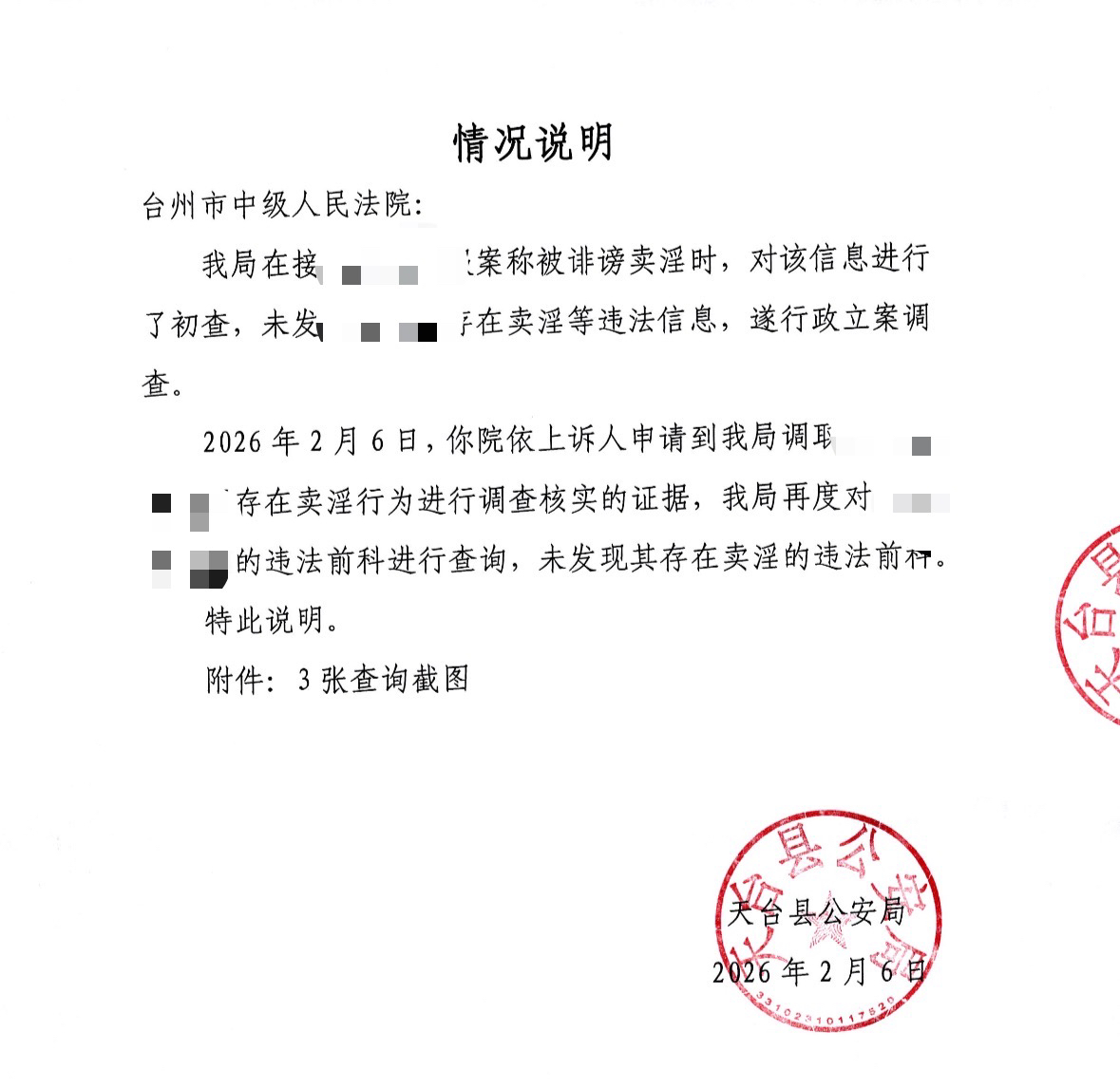 林女士强调,“此次开庭,我的代理律师向法院申请调取,天台县公安局对确认我在微信群所聊事情是谣言的查证过程。在今天的庭审中,天台公安出具了一份情况说明,附有谣言当事人没有违法记录的截图。但我们觉得警方应将认定谣言当事人没有卖淫的全部证据向法庭提交。”