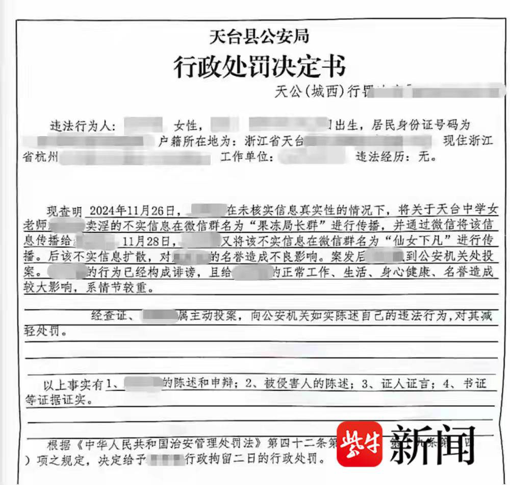 据林女士被行政处罚的决定书显示,现查明2024年11月26日,林女士在未核实信息真实性的情况下,将关于天台中学女老师李某(化名)卖淫的不实信息在微信群名为“果冻局长群”进行传播,并通过微信将该信息传播给钱某(化名)。11月28日林女士又将该不实信息在微信群名为“仙女下凡”进行传播。后该不实信息扩散,对李某的名誉造成不良影响。案发后林女士到公安机关处投案。林女士的行为已经构成诽谤,且给李某的正常工作、生活、身心健康、名誉造成较大影响,系情节较重。经查证,林女士属主动投案,向公安机关如实陈述自己的违法行为,对其减轻处罚。决定给予林女士行政拘留二日的行政处罚。