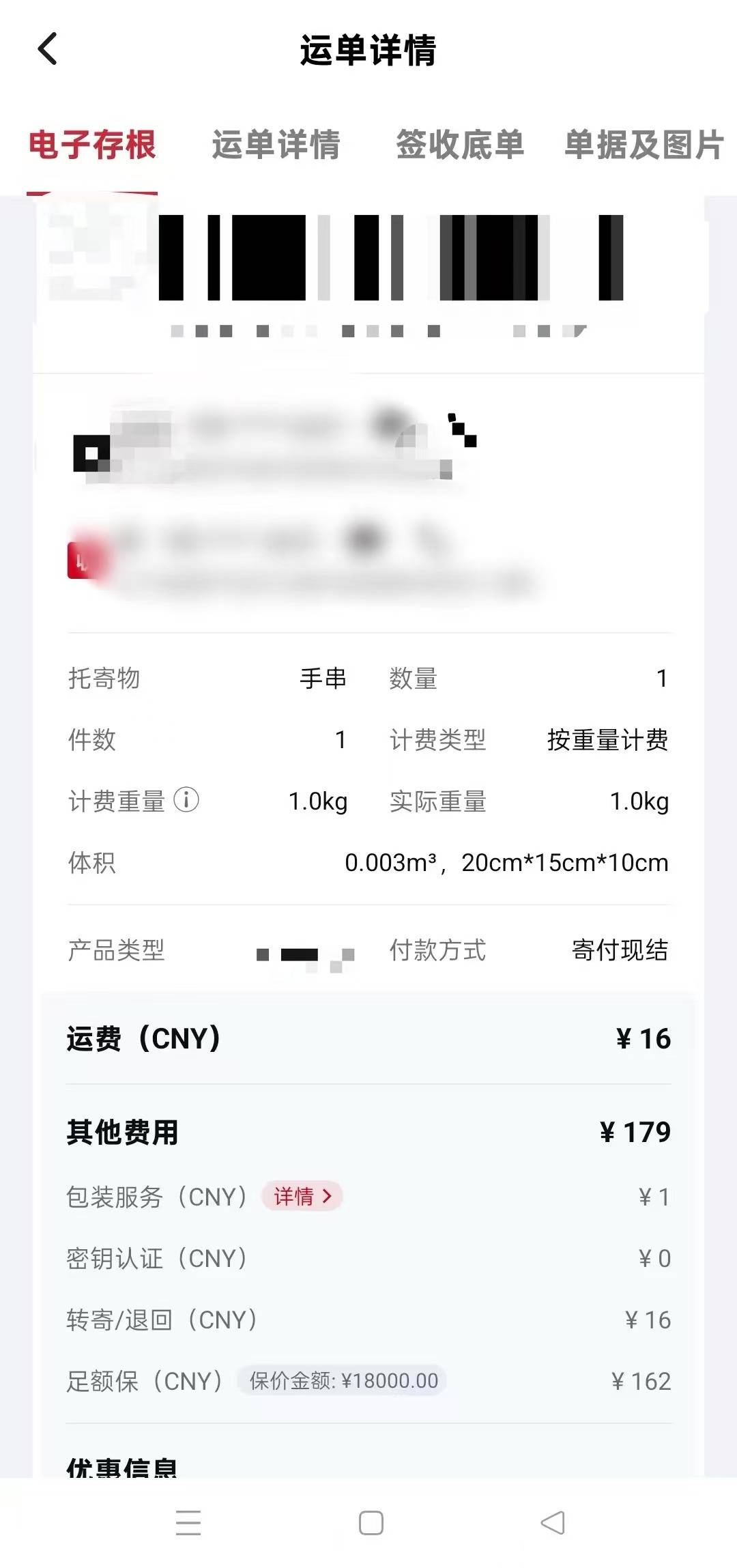 据刘先生介绍,该快件是1月17日从辽宁省锦州市寄出至黑龙江省的核雕手串,同时刘先生为该快件办理了18000元足额保价服务,从刘先生提供的订单详情中可以看到“足额保价162元(保价金额18000元)”。