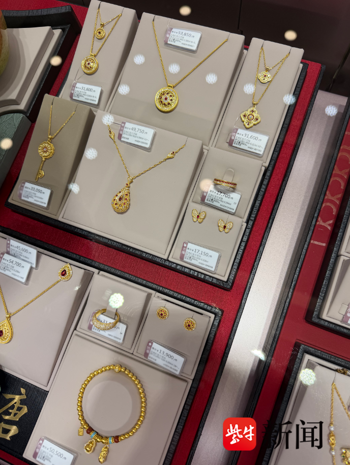 带着消费者的投诉与疑问,紫牛新闻记者进行实地踩访。在南京建邺区某大型商场内,周大生、周大福、潮宏基、老凤祥等品牌专柜前人头攒动。记者注意到,所有品牌均将“一口价”黄金饰品置于黄金柜台的C位或黄金陈列位,这类饰品多镶嵌着钻石、彩宝,工艺看起来更为复杂精致。