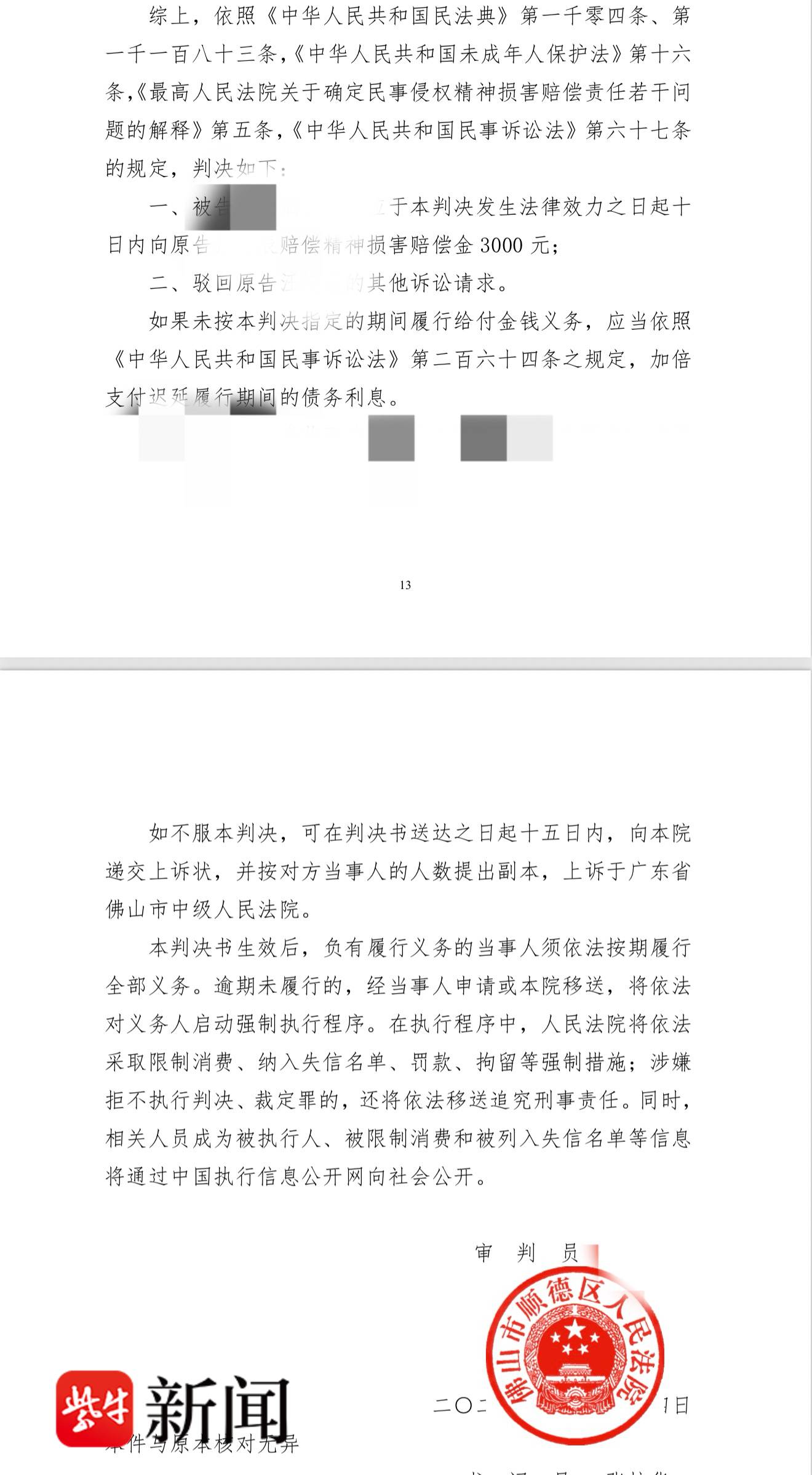 2025年4月,已经回到母亲身边的晨晨以被侵犯生命权、健康权、身体权为由,起诉其生父以及继母。同年6月该案一审开庭,汪女士作为晨晨的代理人出庭,晨晨并未出庭。去年11月,法院一审判决,两名被告应于判决发生法律效力之日起十日内向原告晨晨赔偿精神损害赔偿金3000元。