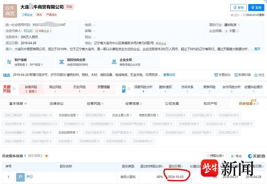 天眼查信息显示,某牛商贸注册资本200万元人民币,法定代表人为石某红,目前公司状态显示存在严重违法行为,已被吊销。2019年4月28日,尹女士被登记为该公司监事、股东,持股比例80%,石某红持股20%。
