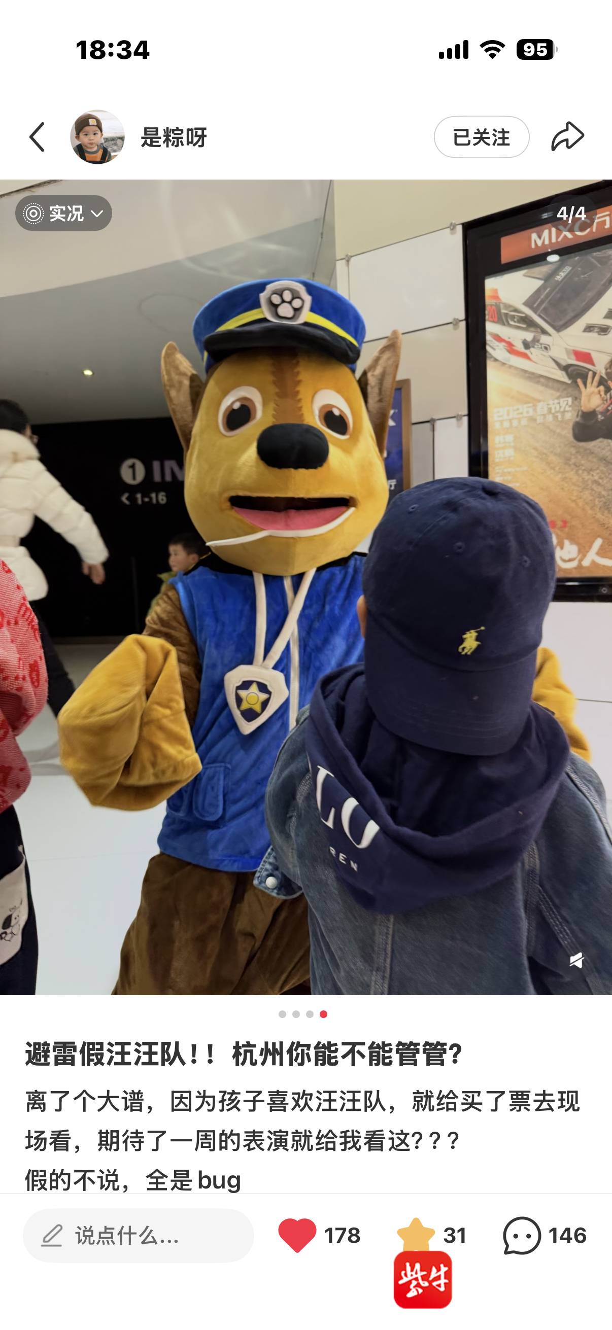 “现场都是配音,而且演员完全都不知道下句话是什么,连草台班子都算不上。”2026年2月7日,浙江网友“阿包包呀”在社交平台发布“避雷汪汪冒险队舞台剧”一帖,同样质疑:“宣传都是用的汪汪队原版动画片,因为小朋友喜欢看汪汪队,所以就买票。但是根本就是货不对板。人家是汪汪队,结果它是汪汪冒险队。”