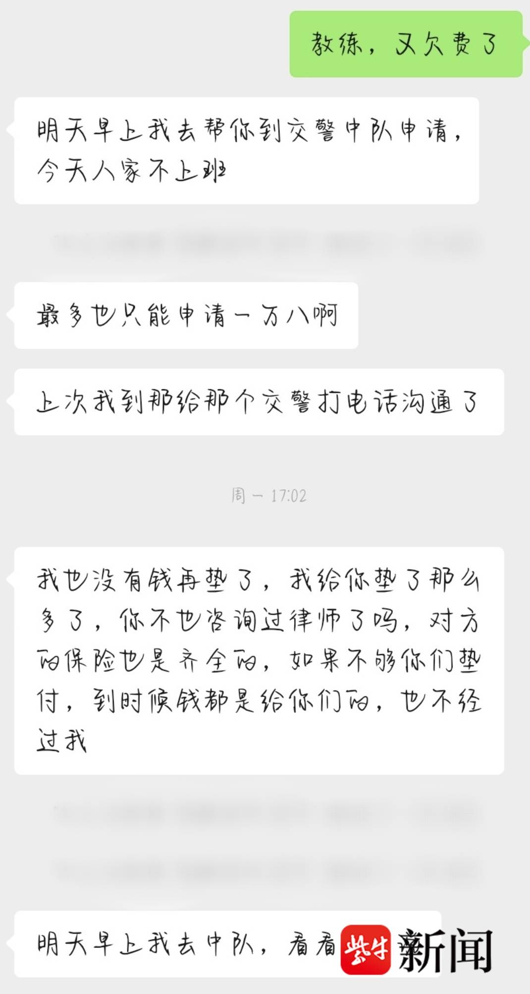 记者又联系到了事故中开车的教练尤某,她表示自己目前已经垫付了较多的医药费,“其实不止5000元,还有护工费、检查费,总共垫了6000多块钱。”