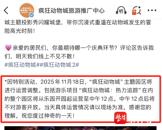 据上海迪士尼度假区公众号一则活动预告推文介绍,为庆祝《疯狂动物城2》上映,自2025年11月18日起,上海迪士尼推出一系列新体验,疯狂动物城园区开启新篇章,11月18日当日园区内会举办《疯狂动物城2》全球庆典活动。同时,据疯狂动物城旅游推广中心微博消息,因特别活动,11月18日整个疯狂动物城主题园区将从乐园开园起运营至中午12点,12点后将不对游客开放。此外,乐园通常开园时间为早上8:30,持有“早享卡”的游客可提前1小时(即7:30)入园。结合孙永辰所提到的通知牌内容来看,游客在该园区当天开放的任意时间内进入,都有可能会被拍摄。