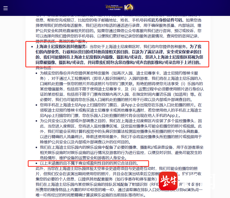扬子晚报/紫牛新闻记者在上海迪士尼官方网站查询时注意到,乐园游客须知和隐私政策中,均有关于“摄像、摄影和/或录音”的提示:“为了我们的内部业务、行政和运营目的或其他直接相关的目的,以及为了满足法律、安全或安保要求的目的,我们可能随时在乐园内摄像、摄影和/或录音,您进入乐园将视为您同意被摄像、摄影和/或录音,并同意我们将包含您肖像和/或声音的影像和/或录音用于上述目的”。同时,该提示还列举了多种具体使用场景,其中包含“以上未涵盖的且不属于商业或盈利性目的的其它合法目的”。