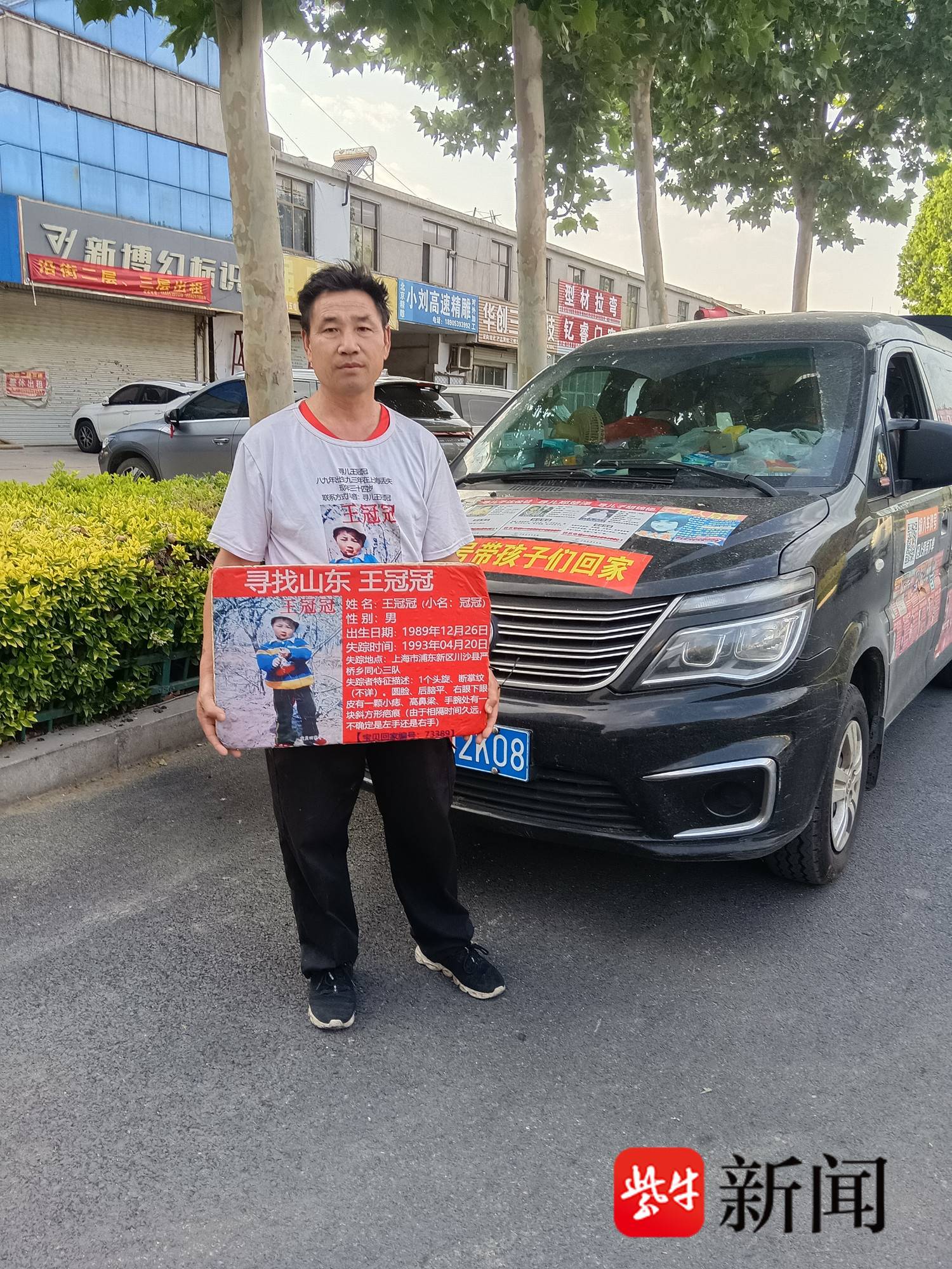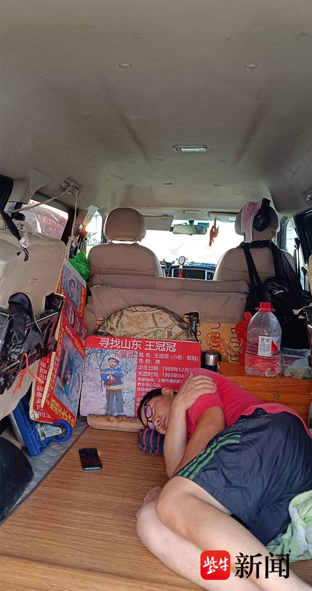 王传强的面包车既是移动的家,也是寻子的“战车”。车身上除了贴着儿子王冠冠的信息,还贴满了其他走失孩子的照片与资料。车厢后部的铁板,就是王传强在外奔波时睡觉休息的地方。每到一处,他停下来或分发传单,或向路人打听消息。