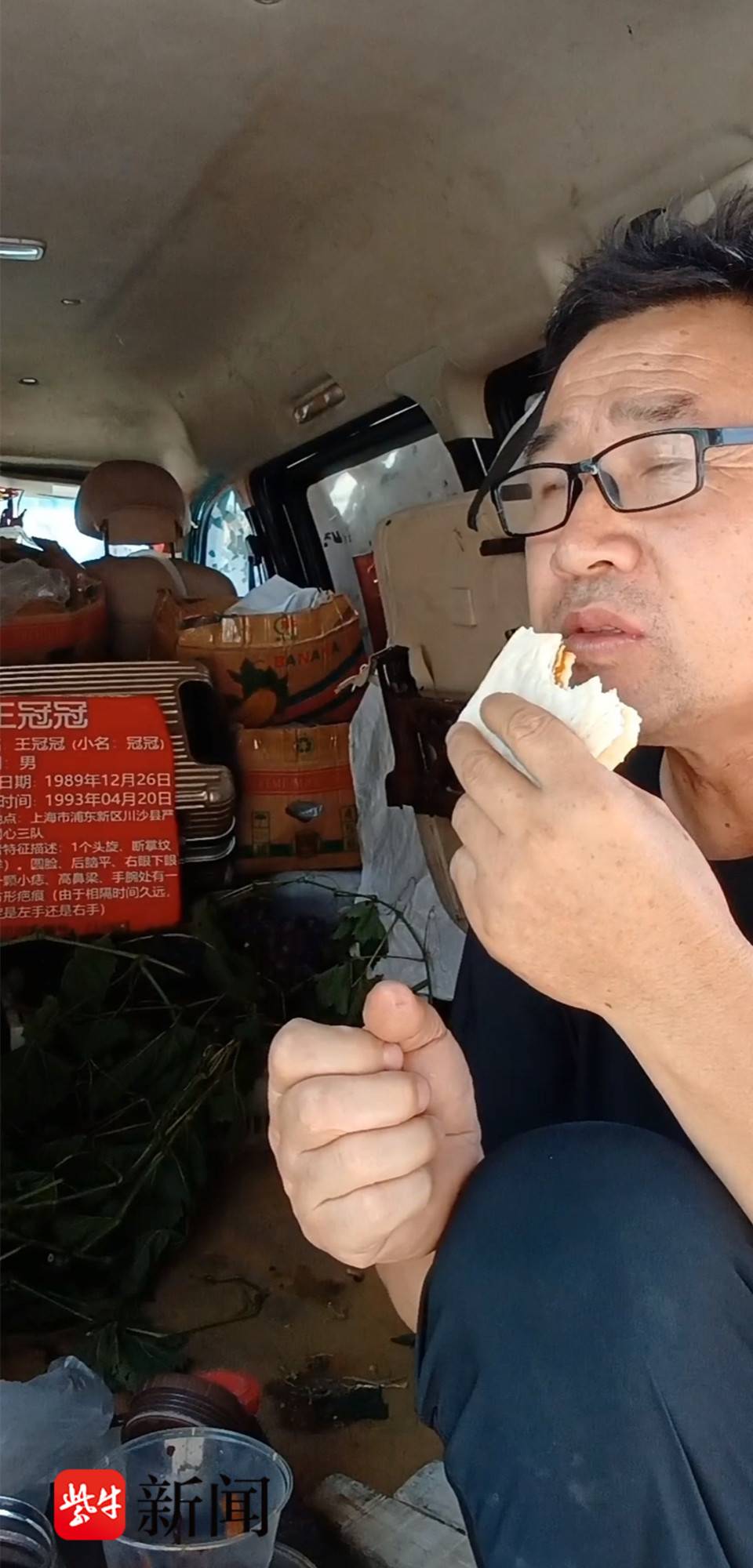 多个视频画面显示,寻子途中,王传强坐在面包车里,有时咬着大葱卷煎饼,有时啃食着馒头,外面或风雪交加,或寒风凛冽。多年来,他一边拉货,一边打零工,挣了钱后,继续踏上寻子的路途。