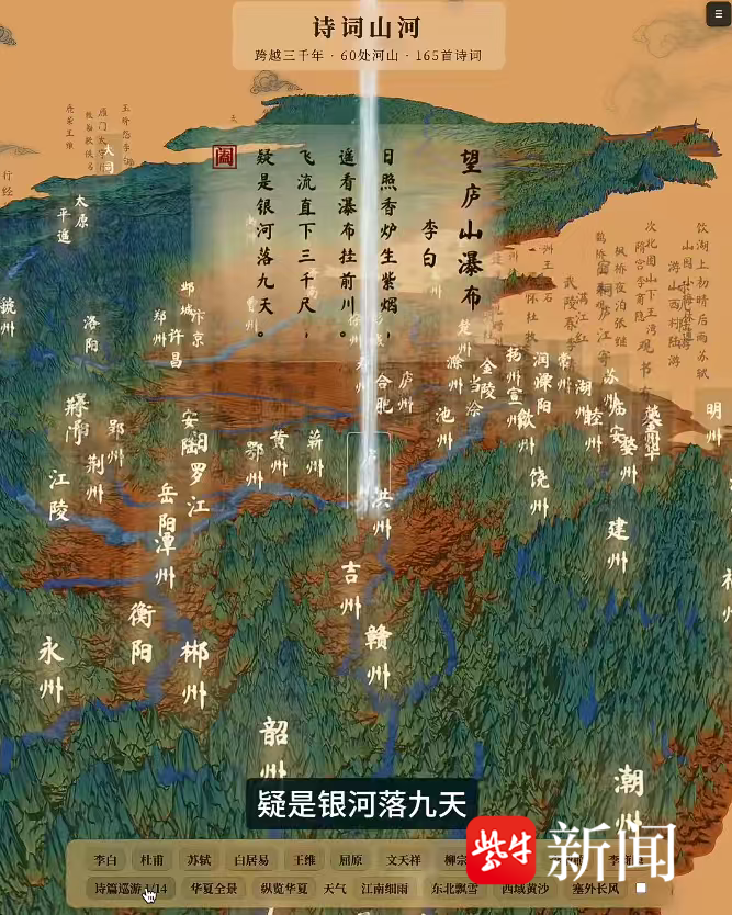 他在近日推出《跟着诗词去旅行》,把165首古代诗词与祖国的大好河山联系在一起。“点击这些悬于山河之上的诗词,就能看到李白醉于庐山之上,飞流直下三千尺,疑是银河落九天。崔颢登临黄鹤楼,远眺黄鹤一去不复返,白云千载空悠悠。苏轼纵马密州郊野,老夫聊发少年狂,左牵黄,右擎苍。”