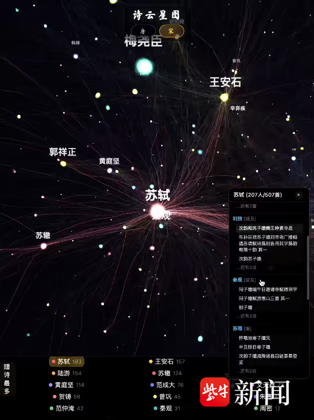 瑞贤在这个方向继续发力,1月25日,他利用AI辅助,推出作品《苏轼的朋友圈对你可见》,将与苏轼有诗词唱和与提及的关系网络可视化表现出来。这个作品如同繁星,中心是苏轼,与他互相赠送诗词、交往越频繁的人,在星图中距离苏轼越近。可以缩放、旋转,点击每个人的名字,能够看到其简介和诗作。