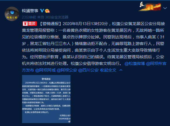【警情通报】2020年8月13日13时20分,松潘公安黄龙景区公安分局接黄龙管理局报警称:一名着黄色衣裙的女性游客在黄龙景区内,无故将她一路所见的垃圾桶部分推倒、景点告示牌部分扯掉。民警到达现场后,当事人曲某(31岁,黑龙江省牡丹江江市人)情绪激动拒不配合,无端辱骂路上游客行人,民警依法将其带回分局接受询问,曲某表示由于个人生活发生重大变故导致情绪行为。经民警批评教育,曲某认识到自己的错误。待黄龙景区管理局核损后,公安机关将依法对其进行处理。松潘公安倡导游客文明出行。